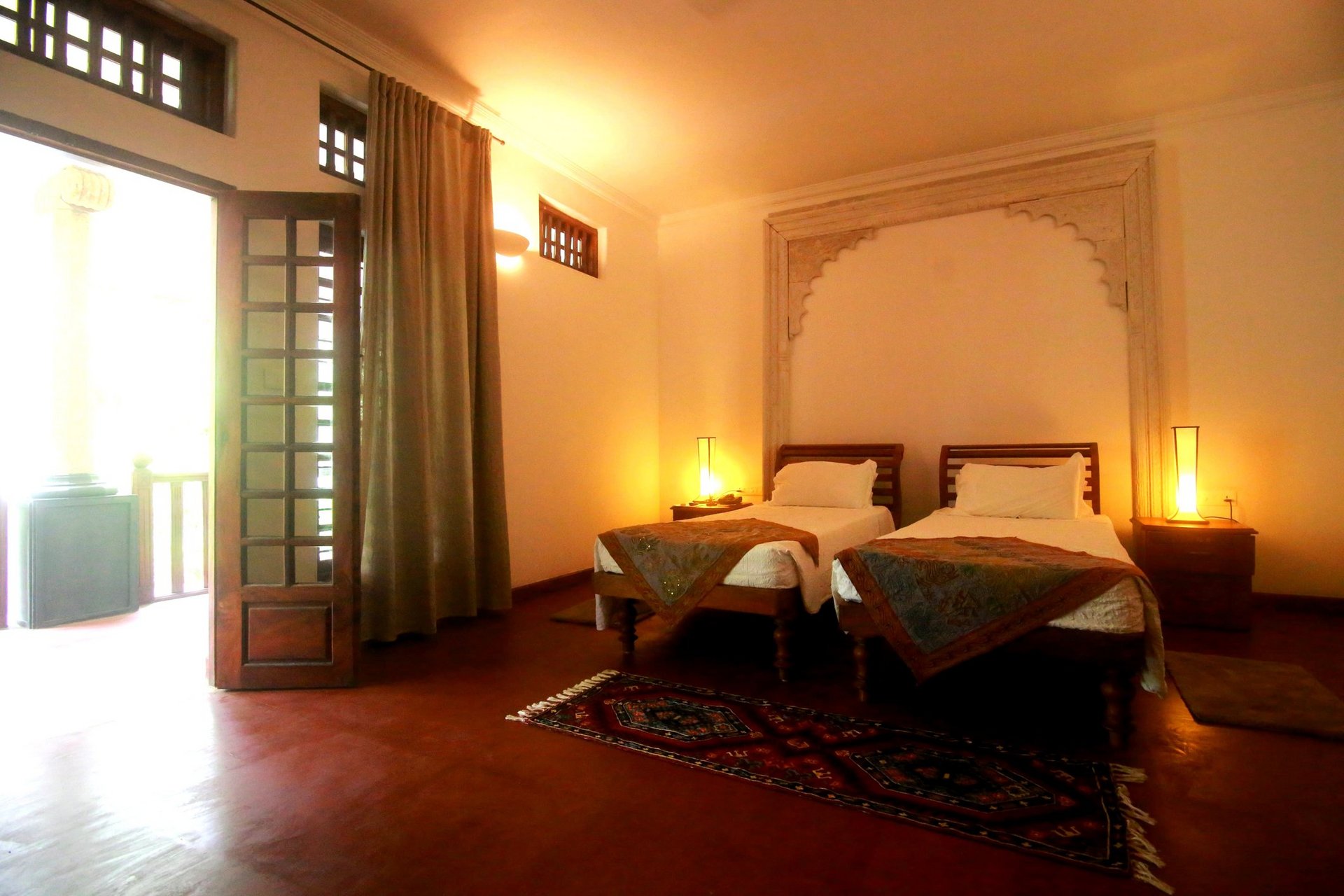 Die Zimmer zur Gartenseite Zimmer (ca. 25 qm) sind im keralischen Stil geschmackvoll mit ausgesuchten handverlesenen Antiquitäten eingerichtet. Die Bäder haben eine Walk-In Dusche/WC und einen Föhn. Die Zimmer verfügen über Telefon, WLAN, Sat.-TV, individuell regulierbare Klimaanlage, Ventilator sowie eine Sitzgelegenheit und einen Schreibtisch.