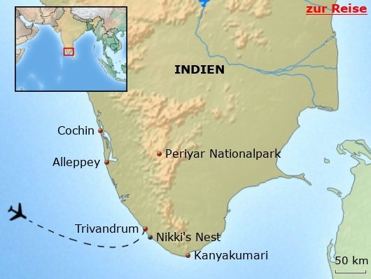 Der nächstgelegene internationale Flughafen ist Trivandrum (Thiruvananthapuram). Von Deutschland aus bestehen Verbindungen mit Umstieg, etwa über die Golfstaaten. Die Flugzeit beträgt je nach Verbindung etwa 12 bis 14 Stunden. Vom Flughafen Trivandrum erreichen Sie das Resort in etwa 30 bis 45 Minuten Fahrzeit. Der Flughafentransfer ist im Arrangement enthalten.