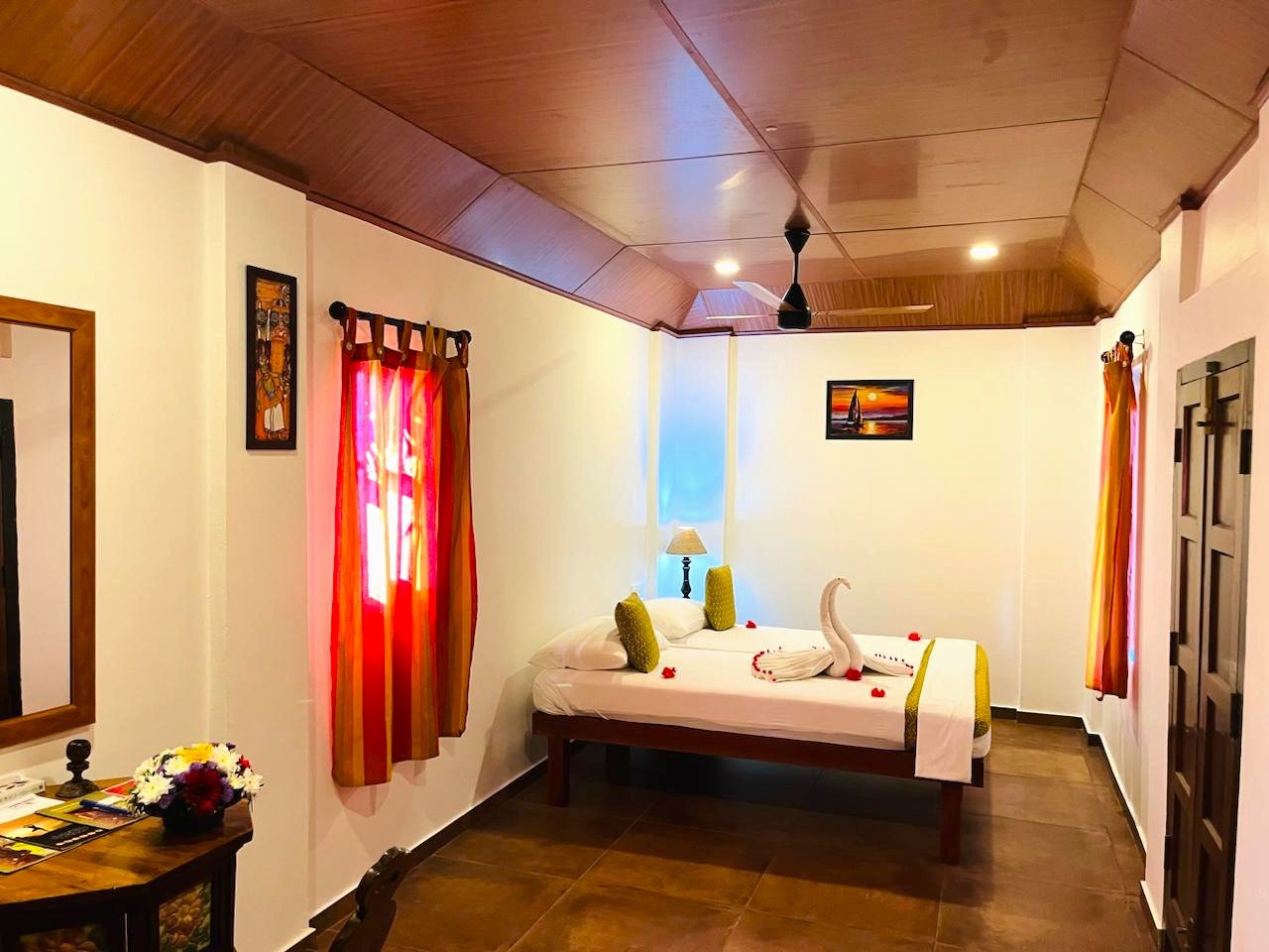 Das neue frei stehende Cottage liegt sehr schön im Garten des Meiveda. Mit ca. 25 qm und eigenem Badezimmer bietet es bequem Raum für 1 Person. Es ist gemütlich im keralischen Stil eingerichtet, das dunkle Holz schafft eine angenehme Atmosphäre. Sie haben direkten Zugang zum Garten.