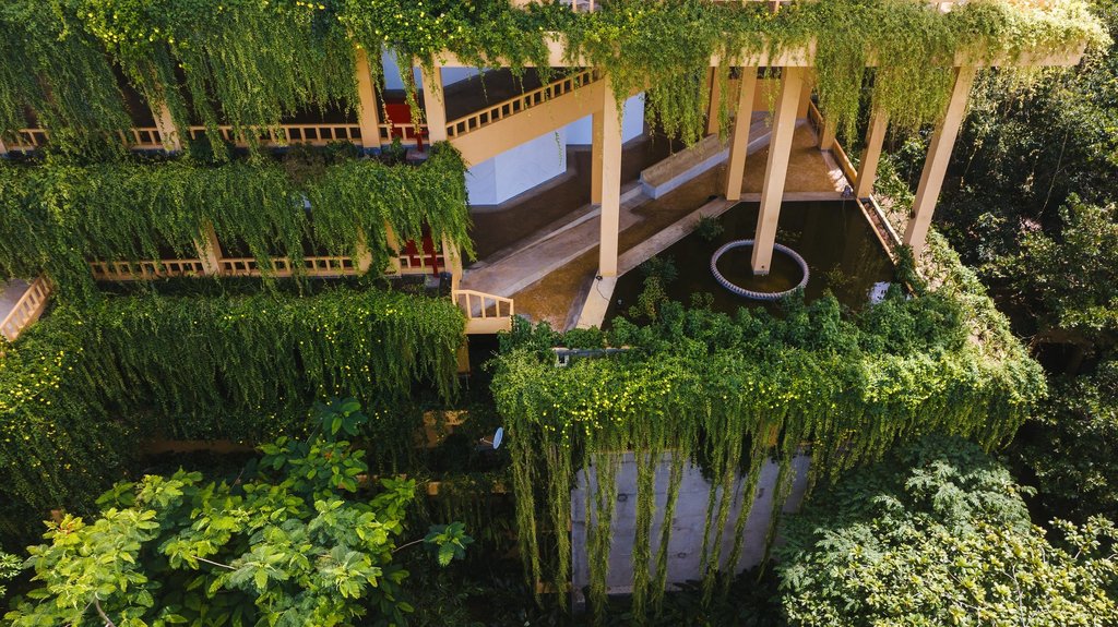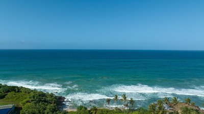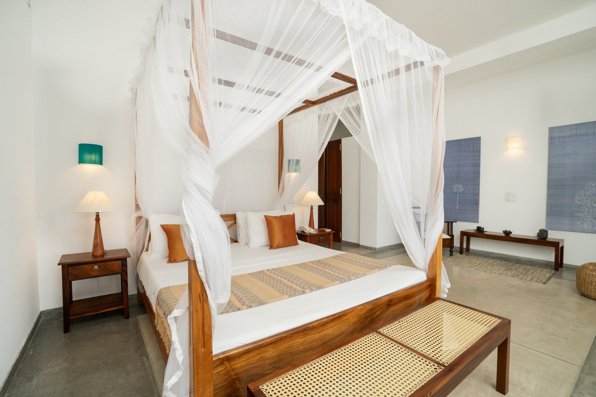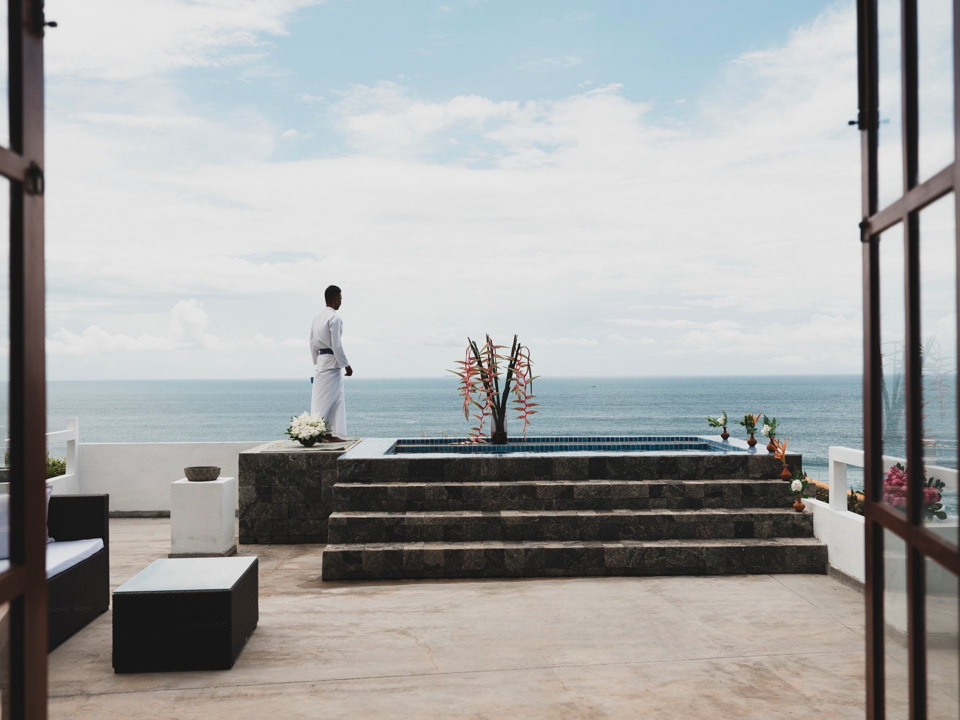Die Waterlilly Suite auf der 5. Etage verfügt über zwei durch eine Trennwand abgeteilte Schlafzimmer mit Kingsize-Betten, einen Wohn- und Essbereich sowie zwei Badezimmer. Der große Balkon bietet einen tollen Blick auf den Ozean, ein benachbartes Dorf und die Natur. Perfekt für Meditation oder Yoga im Sonnenauf- und -untergang. Lokale Materialien und Naturtöne schaffen ein ruhiges Ambiente.