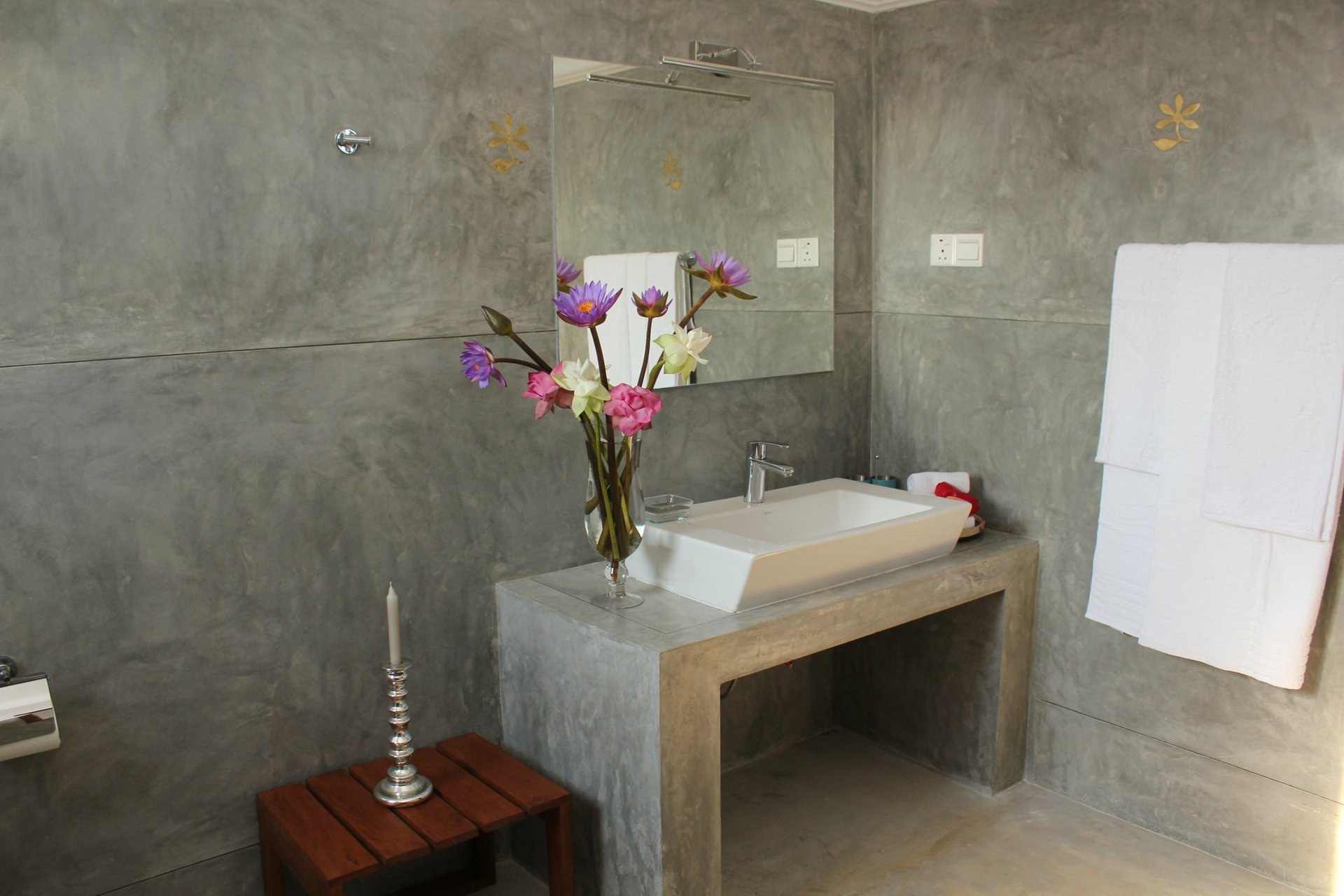 Ihr Tageslichtbad macht Lust auf eigene kleine Wellness Rituale: eine ebenerdige Dusche mit Regenbrause sowie das moderne Waschbecken unterstreichen den puristischen Stil des Interieurs auf sehr geschmackvolle Art und Weise. Duftende Blumenarrangements hier und da, selbst gesammelte Korallen vom Strand sowie vereinzelte Kissen in karibischen Farben dekorieren ästhetisch und liebevoll die Zimmer.