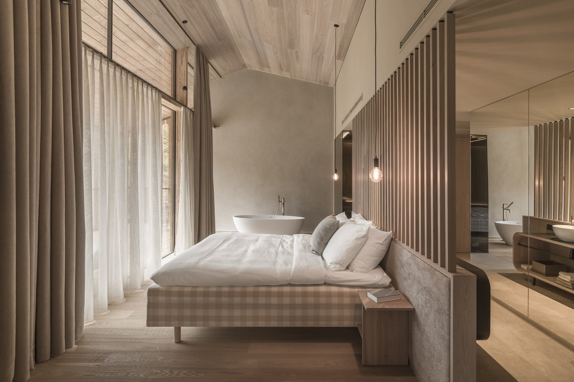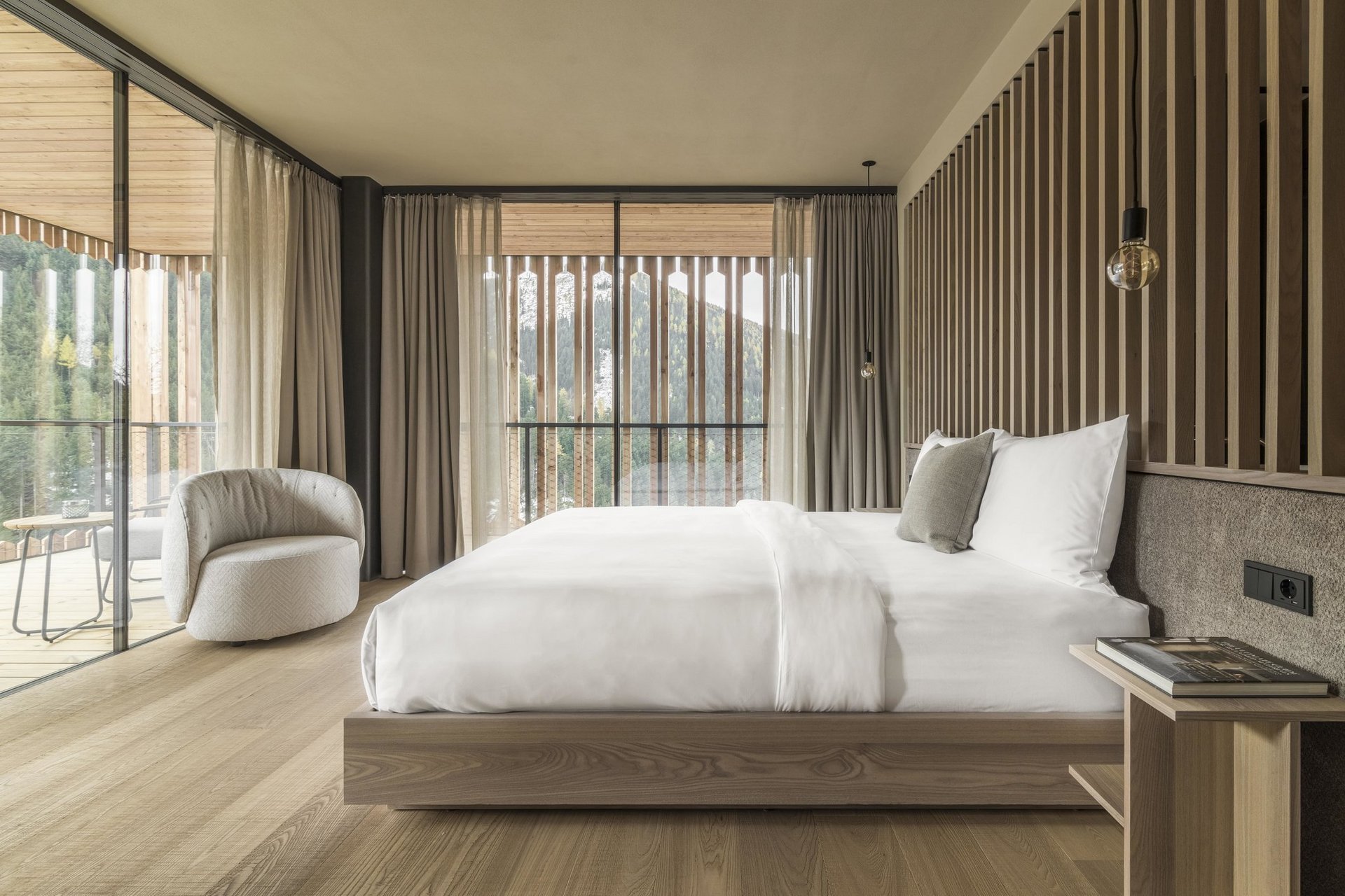 Die Pura Vista Zimmer befinden sich im obersten Stockwerk des modernen Neubaus. Sie sind ca. 30 qm groß und verfügen über einen Balkon mit Blick auf die Dolomiten, einen Naturholzboden, raumhohe Glasfronten und ein offenes Bad, welches harmonisch in den Raum integriert ist. Alle Zimmer sind ausgestattet mit Safe, Sat-TV, Kosmetikspiegel sowie Haartrockner und verfügen über eine Sitzecke. WLAN steht hier bewusst nicht zur Verfügung. Das Doppelzimmer kann auch zur Alleinnutzung gebucht werden. (Beispielbild)
