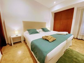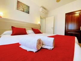 Ein Appartement mit zwei Schlafzimmern mit jeweils eigenem Bad, befindet sich im Obergeschoss des Haupthauses. Ihnen steht hier ein eigenes Schlafzimmer mit Bad zur Verfügung. Der Wohnraum und der überdachte Balkon wird sich mit einer anderen Person geteilt. Die Appartements sind ausgestattet mit Klimaanlage und kostenfreiem WLAN. Ihnen stehen Bademantel, Slipper, Föhn und Pflegeprodukte zur Verfügung.