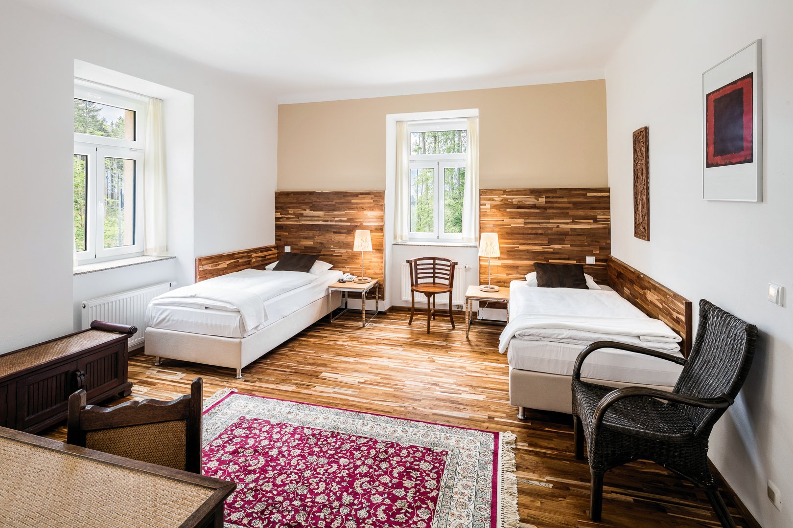 Die Superior-Doppelzimmer (ca. 23-30qm) befinden sich im Hotel Garnison, etwa 70 Meter vom Haupthaus entfernt. Sie sind modern und geschmackvoll ausgestattet und verfügen über große und bequeme Betten, die sich auf Wunsch auch zu einem Queensize-Bett verbinden lassen. Das Badezimmer mit Fenster verfügt über WC, Waschbecken, Dusche und Föhn. Von den Zimmern hat man einen sehr schönen Blick auf die kleine St. Kateřina-Kirche und den Wald. Bademäntel und -schlappen gehören zur Standardausstattung. Die Zimmer sind auch zur Alleinnutzung buchbar. (Beispielbild)